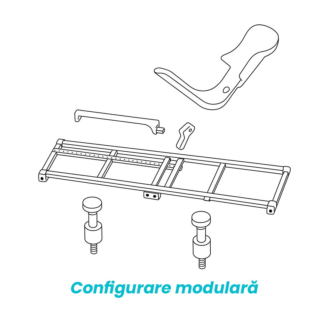 Configurabil cu piese individuale (sistem de prindere de masă central, bară transversală, șină de blocare, gheată pentru picior, șină glisantă)